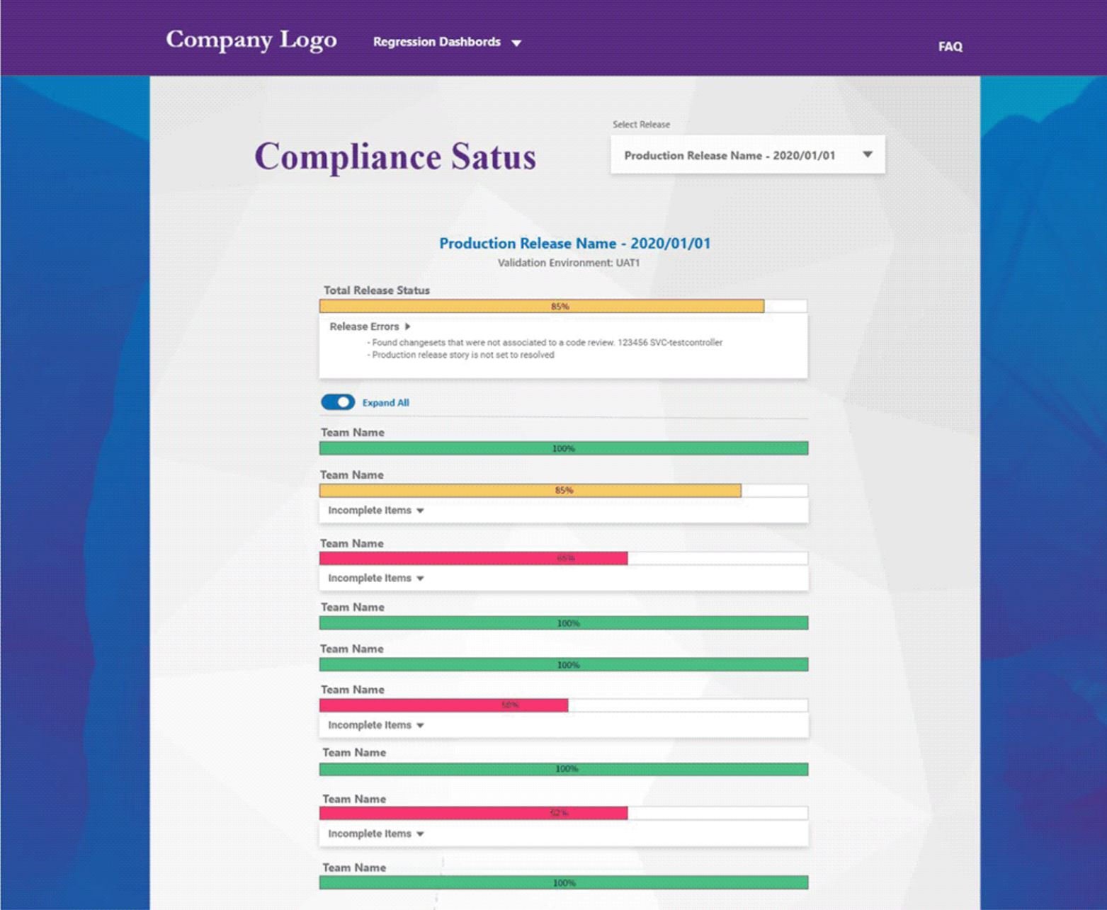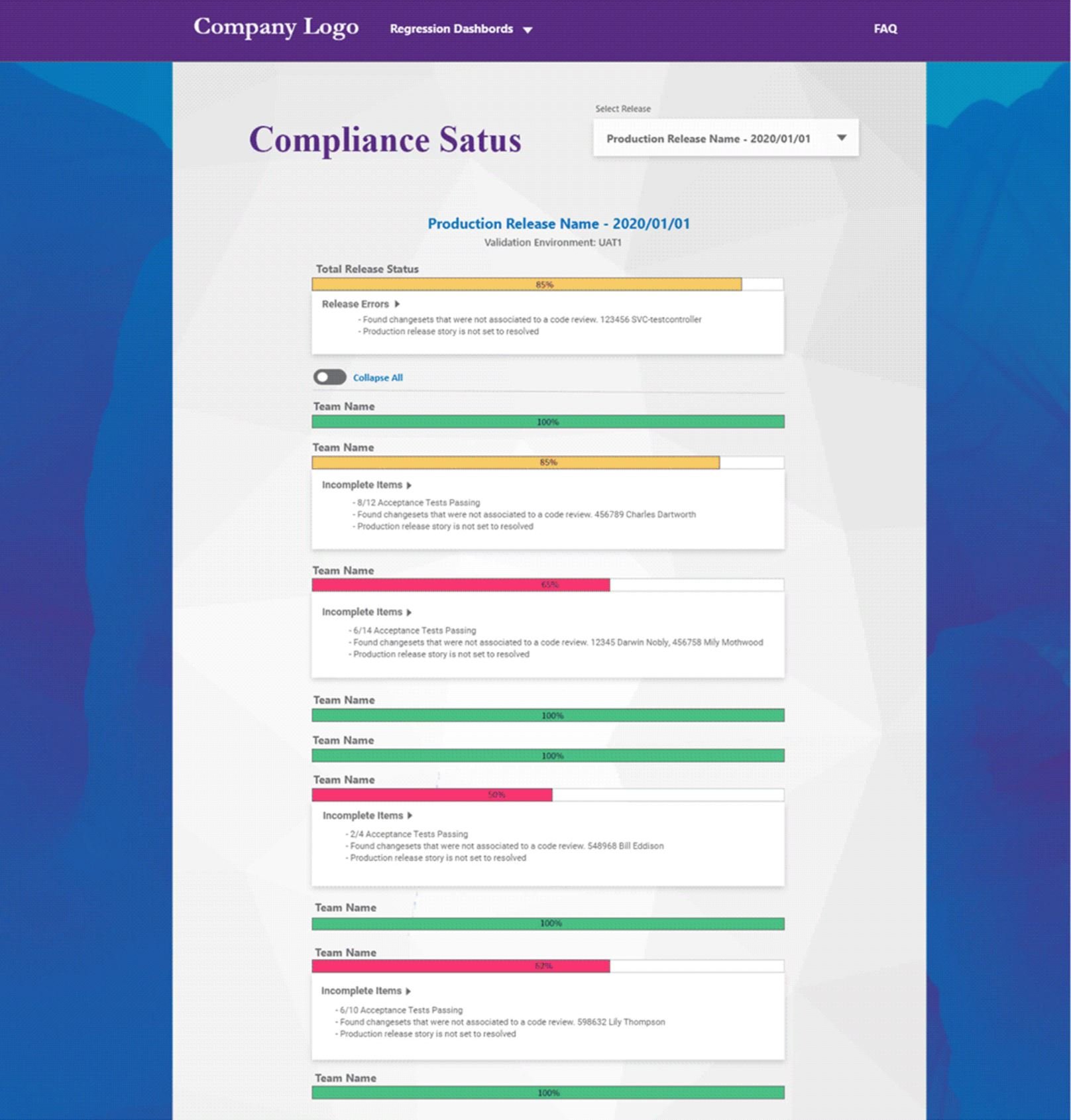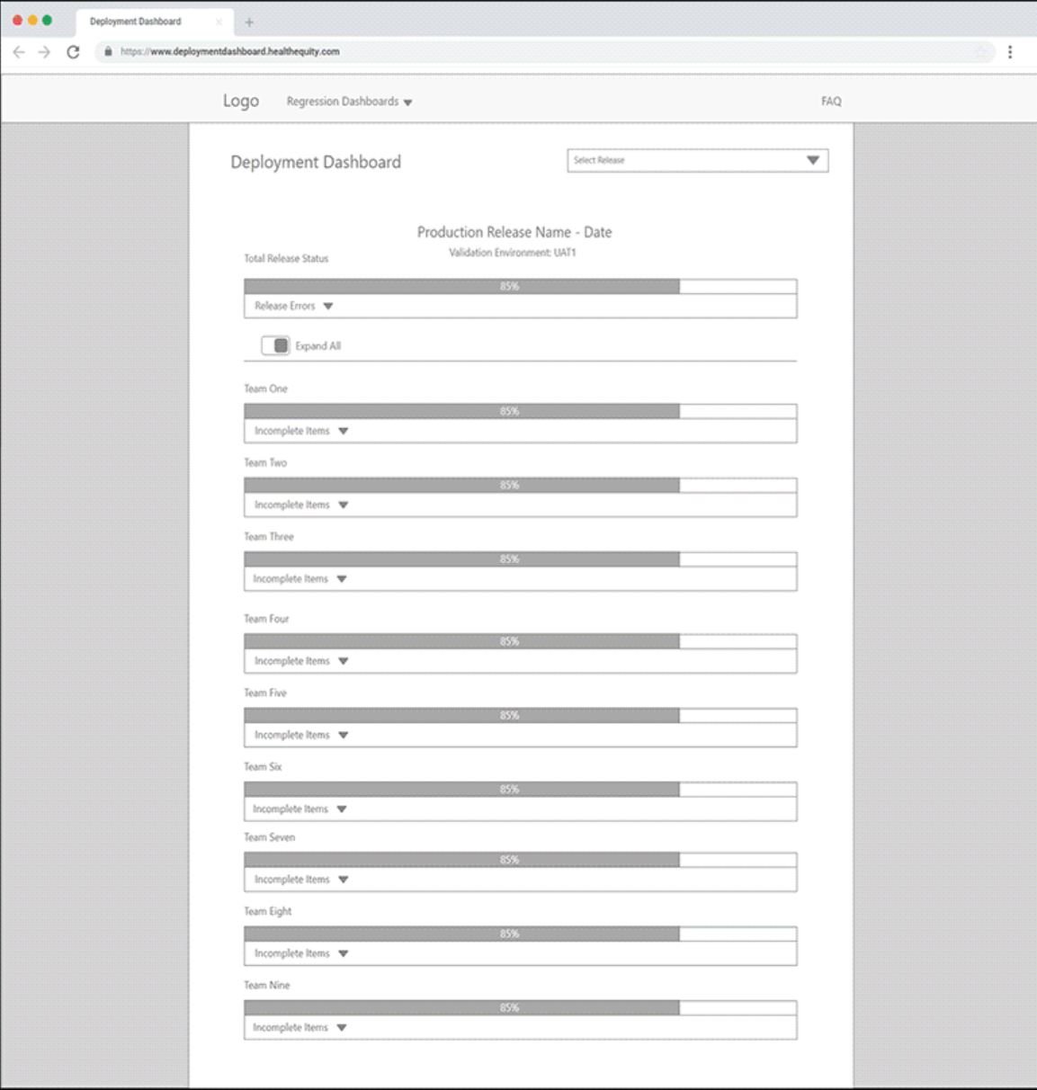 Our goal was to create a product that could easily be accessed from any browser within the engineering department, connect with Azure Devops to bring in and display related data to each release (failing tests, etc.), and display that data to the users in an easy was to understand so product owners and other developers could check if teams were ready to release or not.
