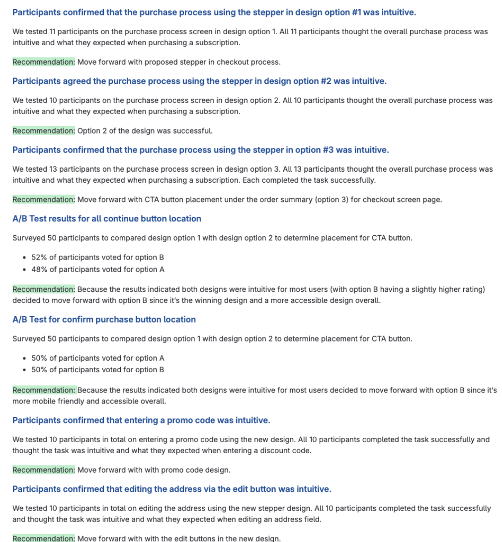 User testing of our redesigned checkout experience yielded overwhelmingly positive results, with participants describing the flow as intuitive and aligned with their